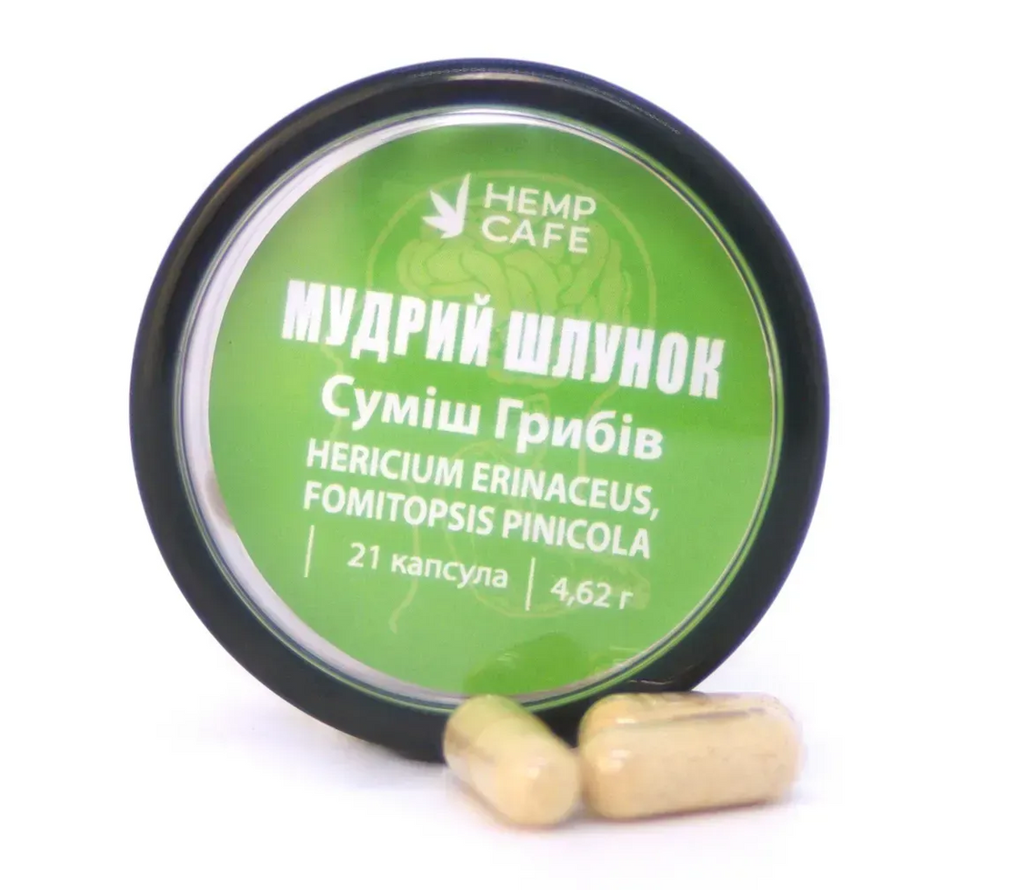 Суміш "Мудрий Шлунок" у зручному капсульованому форматі — це натуральна добавка на основі двох лікувальних грибів: Hericium Erinaceus (Гребінчастий їжовик) та Fomitopsis pinicola (Червонокрайка).